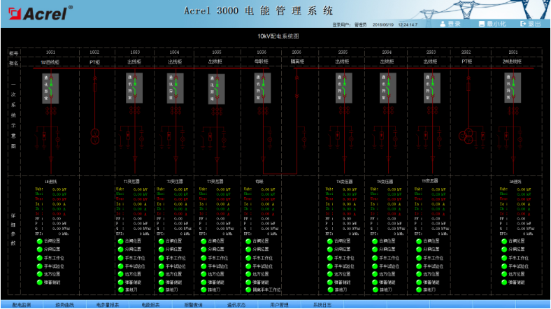 系統(tǒng)人機界面友好,以配電一次圖的形式直觀顯示配電線路的運行狀態(tài),實時監(jiān)測各回路電壓、電流、功率、功率因數(shù)、電能等電參數(shù)信息,動態(tài)監(jiān)視各配電回路斷路器、隔離開關(guān)、地刀等合、分狀態(tài),以及有關(guān)故障、告警等信號。